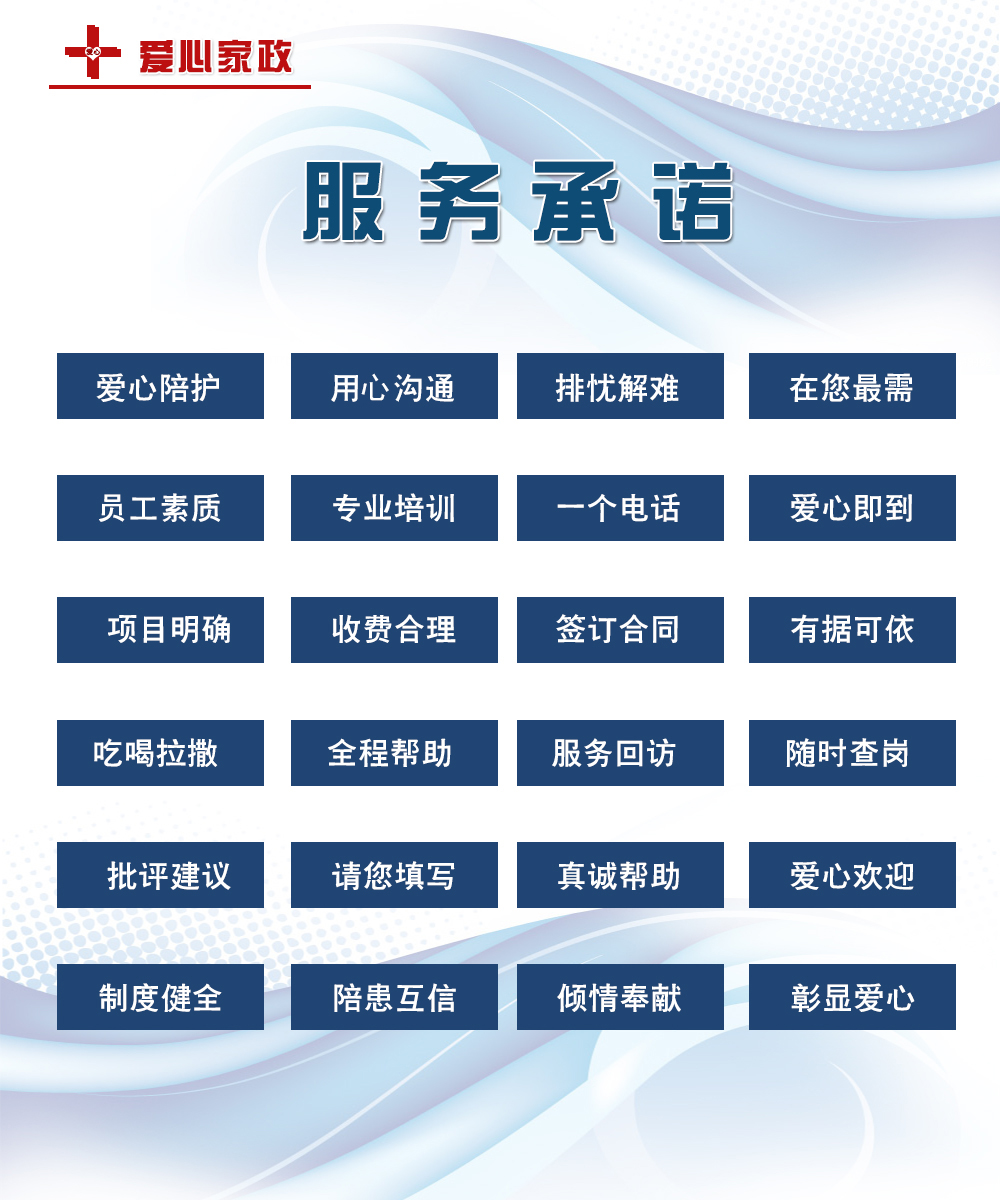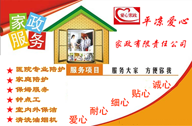 平涼市愛心家政有限責任公司成立于2007年1月,2007年5月掛牌,在平涼市工商局注冊登記。是一家有償服務機構,主要服務項目有:醫院專業陪護、家庭專業陪護、保姆、鐘點工、室內外保潔 。 公司現有男、女、回、漢護工都經過專業培訓,考試合格,并取得相關資質證書,均為持證上崗。 |